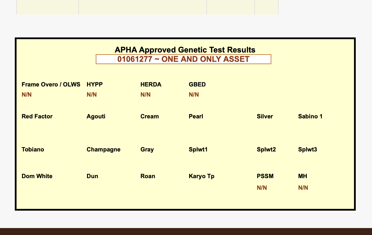 2024 chestnut tobiano APHA filly by multiple World Champion earner and sire, One And Only Asset, and out of a well proven own daughter of John Simon (Special Invitation).