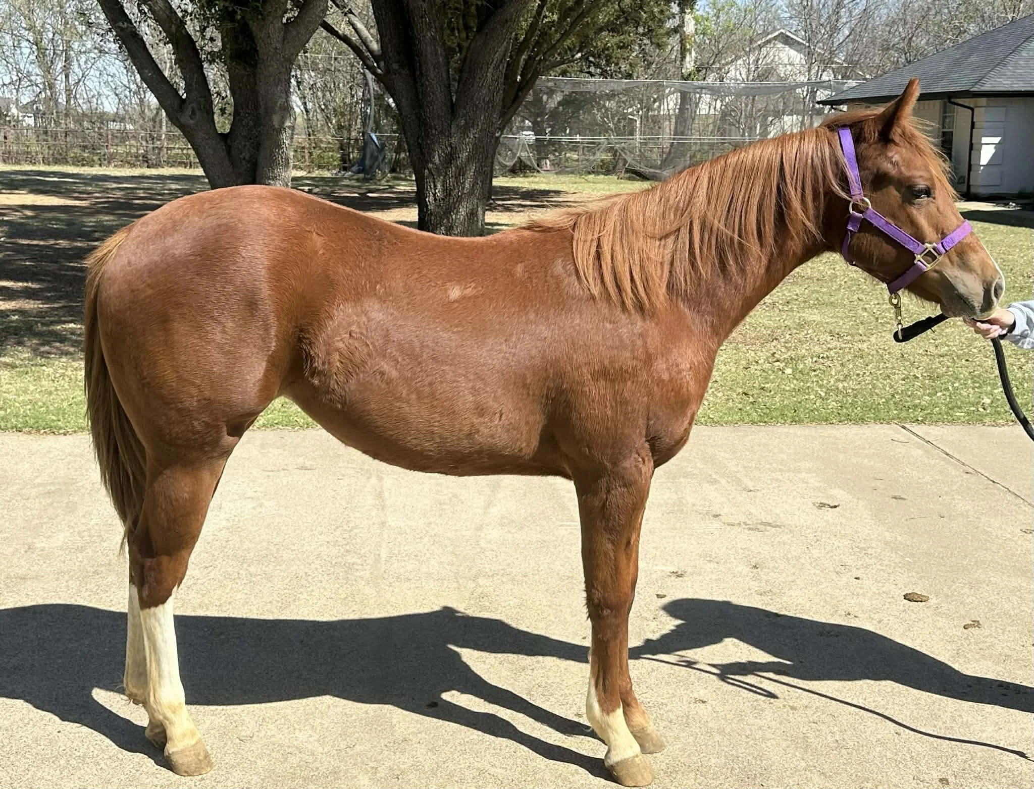 “Gwen” is pretty, sweet, and willing to learn. She has been lightly started on the longe line and also ties, bathes, and clips. Gwen strings to 15.3/16 hh, is 7-panel negative, and carries one copy of W35. She is enrolled in APHA Breeder’s Trust and eligible for other programs including Premier Sires, NSBA BCF/CBCF/IF, and Southern Belle Breeder’s Program.